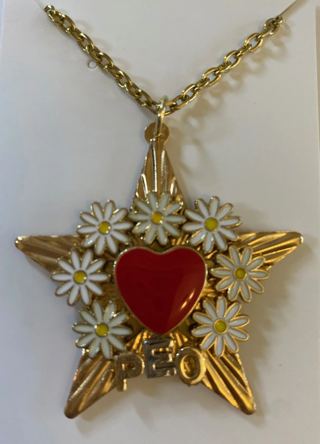 This elegant gold star pendant features a vibrant red heart at its center, surrounded by seven delicate daisies and the letters PEO below. The pendant measures 2 inches in diameter, making it a striking yet tasteful accessory. It hangs from a 24-inch chain, offering a comfortable length that works well with various necklines. Perfect for adding a touch of warmth and charm to any outfit.